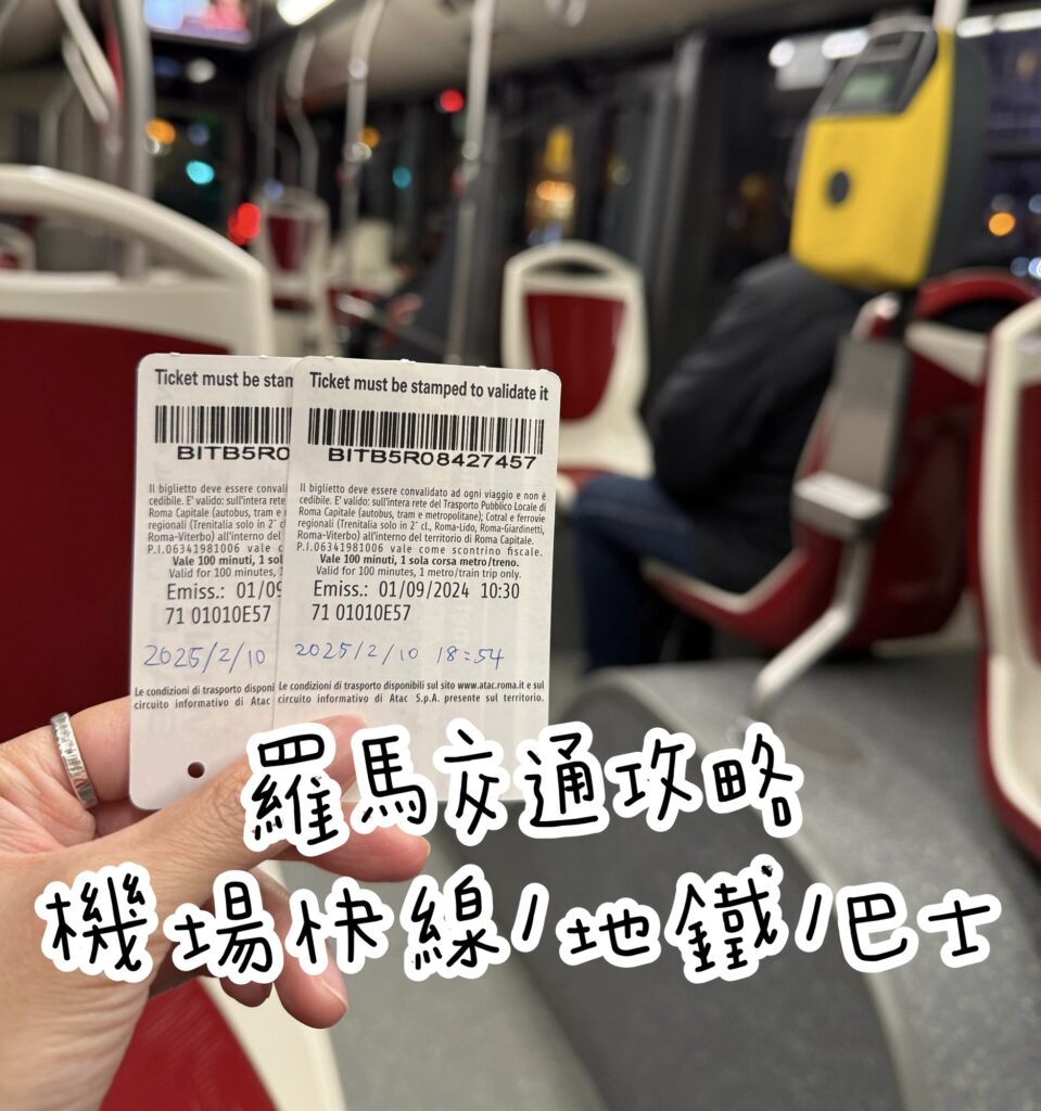 羅馬的公車、地鐵、路面電車只要是購買單程票、多次單程票、一日票、二日票、三日票、周票,三種交通工具都可以搭乘,但需注意單程票僅可於時間內搭乘一次地鐵,其餘皆無限次數。